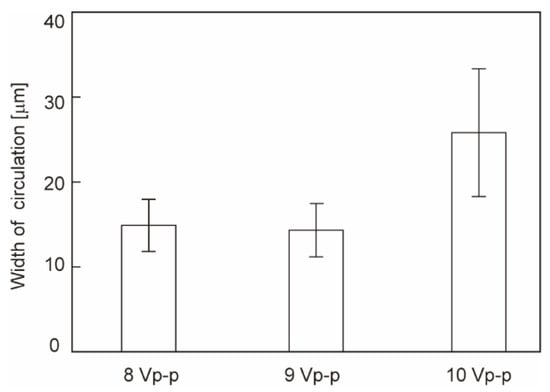 ACEO flow visualized by fluorescent microbeads. The width of circulation indicates the distance of movement of a microbead projected onto a horizontal plane. N = 4. Error bars show the standard deviation.