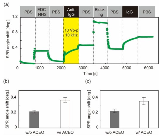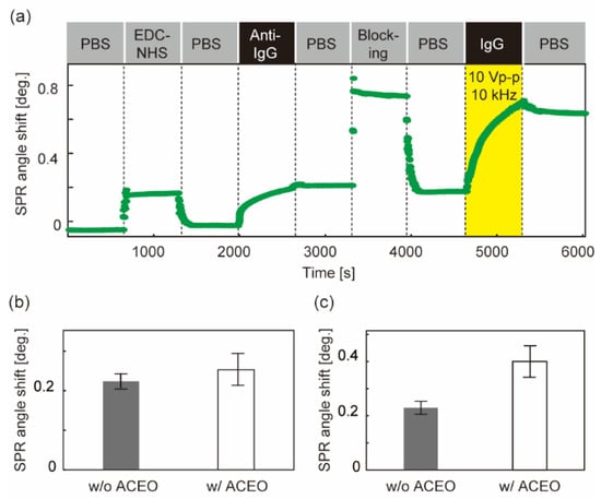 Detection of IgG molecules with ACEO-assisted SPR sensing: (a) SPR sensorgram. The style of the figure is the same as in Figure 4a; (b) SPR angle shift derived from the number of immobilized antibodies; (c) SPR angle shift derived from the analyte bindings. N = 4. Error bars show the standard deviation. Voltage was applied during analyte detection.