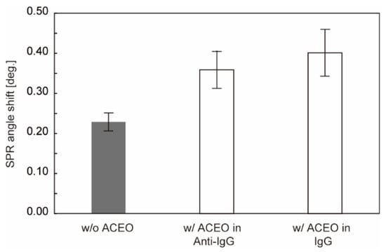 Comparison of SPR angle shift of analyte binding. w/o ACEO indicates the signal obtained from a conventional sensor chip without applying voltage. w/ACEO in Anti-IgG and w/ACEO in IgG indicate the signals obtained by the application of voltage in antibody-immobilization and analyte-binding steps, respectively (N = 4). Error bars show the standard deviation.