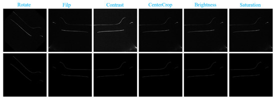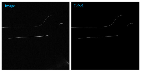 The dataset used in this experiment comes from Chengdu Metro and is provided by Chengdu Leading Technology Co., Ltd in Chengdu, China. It contains various photos of subway operation, including fatigue, abrasions, wear, cracks, dents, and so on. Due to the dark subway driving environment, the gray value of the collected photos is low, so it is difficult to extract the center of the light stripe accurately and effectively by traditional methods. The dataset of subway wheelset laser curve contains 100 original pictures with the size of 1236 pixels * 1624 pixels and corresponding annotated pictures. Figure 1 is the original image and labeled image of the subway wheelset data graph. The left is the original image, and the right is the labeled image. In data annotation, per-pixel annotation is adopted to make the center of the light stripe fall on the annotation point as far as possible, so the label is a thin line of one-pixel width.