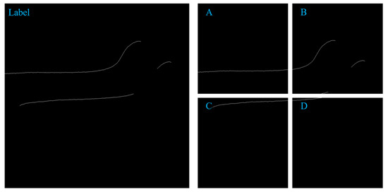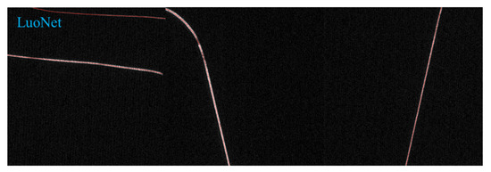 Models Ablation Study: A model ablation experiment was also conducted in this paper. Data tests were conducted on the visualization results of LuoNet_A, LuoNet_B, LuoNet_C, LuoNet_AB, LuoNet_BC, LuoNet_CA, and LuoNet (LuoNet_ABC). The test results are shown in Table 3, and it can be seen from the data indicators that the LuoNet designed by us has the best effect. The F1_score, Accuracy rate, Recall rate, and Miou ratio of LuoNet’s prediction results reached 71.4%, 62.3%, 83.5%, and 78.1%, respectively. The four indexes were all higher than the experimental results of LuoNet_A, LuoNet_B, LuoNet_C, LuoNet_AB, LuoNet_BC, and LuoNet_CA groups. It can be seen that LuoNet can better extract the stripe center of a subway wheelset laser curve, so we chose LuoNet as the subway wheelset laser curve centerline extraction algorithm.