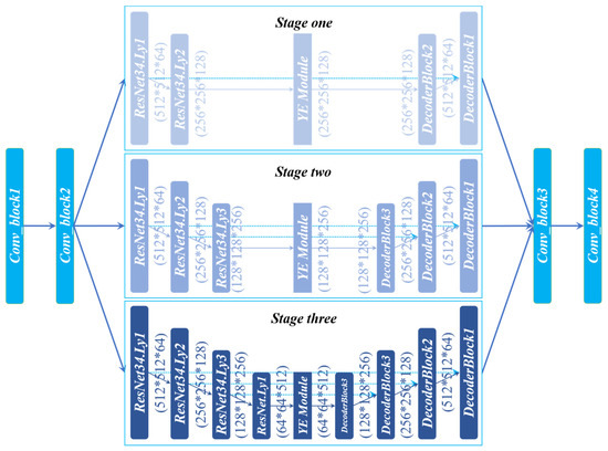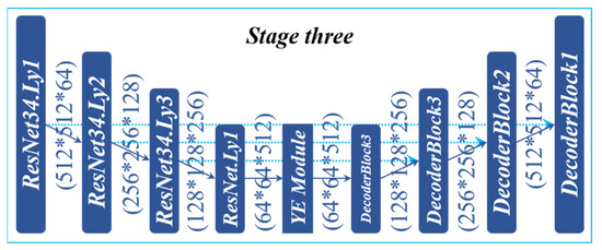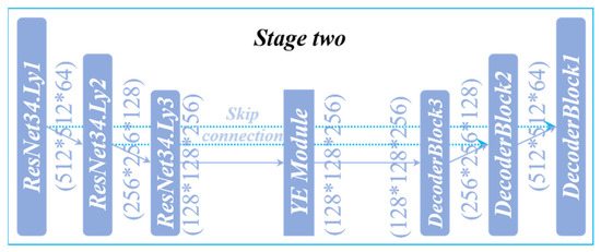 In Stage Two, the UNet_B network structure (UNet_B) is used, as shown in Figure 7. ResNet34 is used as the backbone in the coding structure, which can strengthen the transmission of features and reduce the number of parameters. The attention module (YE Module) is added at the bottom of the network structure. In UNet_B, the shallow and deep features can be paid attention to through YE Module, which enables the network to obtain more detailed information and spatial information. The decoding part is composed of DecoderBlock with a small number of parameters, which can decode information, recover spatial information, and improve the resolution. The depth of the whole structure is three layers. The number of channels in the coding layer increases from 64 to 128 and then from 128 to 256. The size of the feature map decreases from 512 * 512 to 256 * 256, and then from 256 * 256 to 128 * 128. After the attention module, the stage of decoding is entered, channel number again goes from 256 to 128, down from 128 to 64, the future map size is restored from 128 * 128 to 256 * 256, and then from 256 * 256 to 512 * 512, each layer of the encoding and decoding layer through the Skip Connection is linked together, can reduce the coding layer because of the loss caused by the Downsampling, and, at the same time, help the Decoder to recover more detailed information. When a network uses only UNet_B, the model is called LuoNet_B.