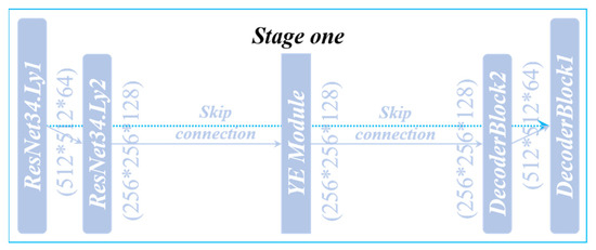 The UNet_A network structure (UNet_A) used in Stage One is shown in Figure 6. ResNet34 is adopted as the backbone in the coding part, which can enhance the transmission of features and reduce the number of parameters. The attention module (YE Module) is added at the bottom of the network structure. In the UNet_A Module, more shallow features can be paid attention to through YE Module so that Stage One can learn more detailed information and help the decoding process to better restore features. The decoding part is composed of DecoderBlock, which can decode information, recover spatial information, and improve the resolution. The depth of the whole structure is divided into two layers, the number of channels in the coding layer increases from 64 to 128, and the size of the feature map decreases from 512 * 512 to 256 * 256. After the YE Module, it enters the decoding stage, the number of channels is reduced from 128 to 64 again, and the size of the feature map is restored from 256 * 256 to 512 * 512. Each layer makes up for the loss caused by Encoder through Skip Connection. When a network user uses only UNet_A, the model is called LuoNet_A.