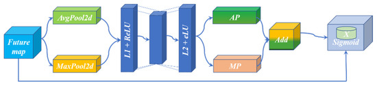 In Formula (1), after feature graph f enters the AvgPool layer, it enters linear layer L1 and linear layer L2 to obtain feature graph AP. After feature graph f enters the MaxPool layer, it also enters linear layer L1 and linear layer L2 to obtain feature graph MP. Finally, a sigmoid operation is performed on the result of adding AP and MP.