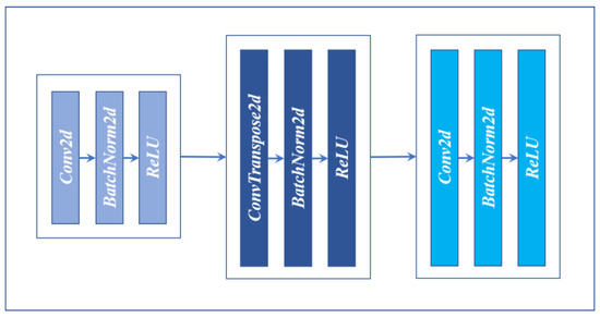 The encoding structure (DecoderBlock) is shown in Figure 10. DecoderBlock has three convolution layers. The first layer is made up of a convolution of Kernel Size 1, Strides 1, including the BN layer and ReLU layer. The second layer is made up of the Deconvolution of Kernel Size 3, Strides 2, and includes the BN layer and ReLU layer. The third layer, like the first one, contains Kernel Size 1, Strides 1, Convolution, BN, ReLU, with the difference in channels for input and output. The whole structure channel is first decreased and then increased, similar to an hourglass. The purpose of this method is not only to reduce the number of parameters but also to recover spatial information better.