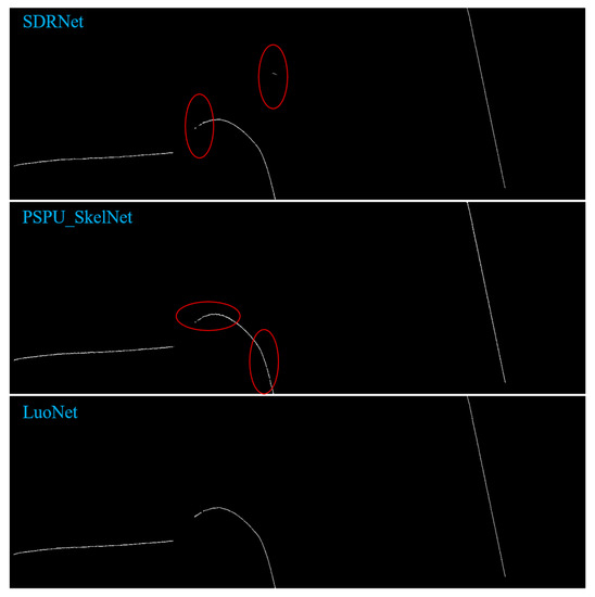 We trained LuoNet for 200 epochs starting with a learning rate of 1 × 10−3 and decreasing to 1 × 10−4 at 60 epochs and 1 × 10−5 at 120 epochs. Adam optimizer is used for training, the learning rate is set with the distribution decline method, and the Loss function adopts the Binary cross-entropy and Dice Loss. To verify the effectiveness of the network extraction results designed in this paper, we used horizontal, curved, and vertical samples to test, and compared the recently popular skeleton extraction networks. As shown in Figure 11, we have visualized the extraction results of different networks from top to bottom, namely the skeleton extraction results of UNet [16], SDRNet [17], PSPU_SkelNet, and LuoNet. By comparing the original image and label image with the extraction results of UNet and SDRNet, we can find that the extraction results of UNet and SDRNet identify the places that are not skeletons as skeletons, and the places with relatively small gray value have more serious losses. From the comparison of PSPU_SkelNet with the original image and label image, the extraction results of PSPU_SkelNet can distinguish the real skeleton to a certain extent, but the places with low gray values also have some missing parts. Compared with the extraction results of other networks, the LuoNet designed by us can achieve a stable effect even in the place where the gray value is relatively low. The LuoNet designed by us can achieve a good effect no matter if in the horizontal, curved, and longitudinal samples.