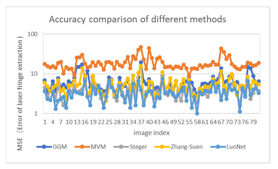 In this paper, to test the extraction deep learning skeleton extraction network LuoNet and the subway wheel to extract the effectiveness of the laser curve, the test samples were selected under extreme conditions with an extremely low gray value, uneven gray distribution, and serious background interference. In order to improve the feasibility, transverse, longitudinal, and curved samples were selected for the experiment. We compared the common optical center extraction algorithm, as shown in Figure 12. From top to bottom is in accordance with the gray centroid method (GGM), the maximum value method (MVM), the Steger method, Zhang-Suen skeleton extraction (Zhang-Suen) [6], and deep learning method (LuoNet) extraction results. It can be seen that the traditional laser stripe extraction method is unable to do anything for the subway wheelset laser curve with uneven brightness. Due to the serious interference of ambient light and noise, the complete laser curve contour cannot be obtained. There is a discontinuity in the extraction of the light stripe center, and it is seriously missing in some places with low gray values. The gray center of gravity method has a higher requirement on the gray value distribution of the light stripe, and the effect is not very good for the situation that the gray value of the subway wheelset laser curve has a largely random distribution. As can be seen from the figure, the gray center of gravity method and extreme value method require the gray distribution of the stripe to be a Gaussian distribution. For the test samples we selected under extreme conditions, the gray center method could not find centers in some places with low gray values, and multiple centers appeared in some places. The extreme value method is more sensitive to noise, and the noise is judged in some areas, and the phenomenon of missing detection appears in places with low gray values. The extremum method only focuses on where the extremum occurs, and, in many places, there are multiple extremums, hence the emergence of multiple centers. The effect of Steger method is relatively good, but serious missed detection occurs in the area with low gray value, resulting in more discontinuities in the centerline. Steger method has a large amount of calculation and low efficiency, so it cannot extract the center of the strip quickly, and the inappropriate Gaussian kernel selection may lead to the distortion of image information. It is difficult to ensure that the result is a single pixel in the center of the light stripe extracted by the Zhang-Suen skeleton thinning method, and Burr and missing in some places. For the place with a low gray value and complete place, the traditional method is difficult to find the center by algorithm; the traditional method depends on the light intensity and gray level in the Gaussian distribution method. The gray level distribution is very irregular in terms of the conditions required to achieve good results. The LuoNet method of deep learning skeleton extraction proposed in this paper has a strong anti-interference ability, and the extraction results of the light stripe center are stable and clear.