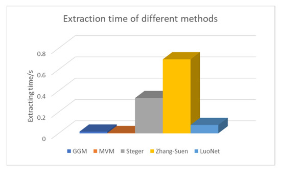 Counting the time taken by different algorithms to extract the center of the light bar, the time diagram in Figure 14 can be drawn. The size of the test image is 512 * 512 pixels. It can be seen from the histogram that the GGM method represented by blue and the MVM represented by orange take the least time, but the extraction accuracy is poor. The Steger method represented by gray and the Zhang-Suen method represented by yellow require a large amount of computation and a high time complexity. Light blue represents the method proposed in this paper. The execution time of the algorithm proposed in this paper is 0.078s per image, which is less than the Steger method. The extraction accuracy and algorithm time complexity are considered comprehensively. Under the condition of ensuring the same accuracy, the algorithm proposed in this paper takes less time.
