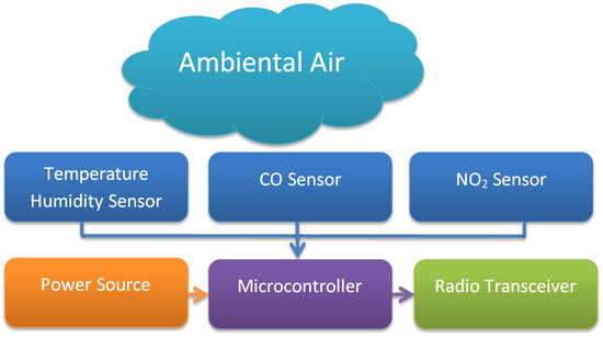 Currently, the sensing unit is equipped with sensors for measuring carbon monoxide (CO), nitrogen dioxide (NO2), temperature, and humidity. The sensors are manufactured by AppliedSensor GmbH (currently known as AMS AG). AppliedSensor iAQ-core and AS-MLN use MOS technology in order to measure CO and NO2 [27,28].