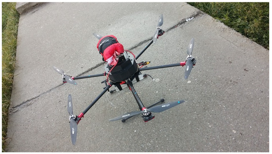 For the proposed system, an unmanned multi-rotor aerial copter has been assembled using off-the-shelf components (Figure 4). A hexa-rotor aerial vehicle was chosen, which is designed to use six-rotor components, positioned in a six corner star layout, which are attached to a custom made carbon fibre frame, with special mountings to reduce additional rotor vibrations. Compared to a quad-rotor, a hexa-rotor copter makes use of two additional rotors that offer better manoeuvrability and provides the possibility of carrying more payload, but at the expense of a shorter flying time. The rotors are manufactured by KDE-Direct, model KDE2814XF-515KV, and offer an excellent efficiency of 13 g/W with each having attached a 14 × 4.8 carbon fibre propeller manufactured by RC Tiger Motors.
