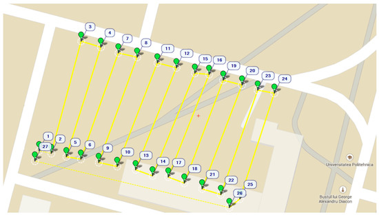 In the second type of flying mission, the UAV completes a marked course (represented in Figure 5) at a given constant altitude and continuously samples data, in order to generate fine-grained pollution heat maps that can estimate the dispersion of a specific gaseous pollutant over a certain area.