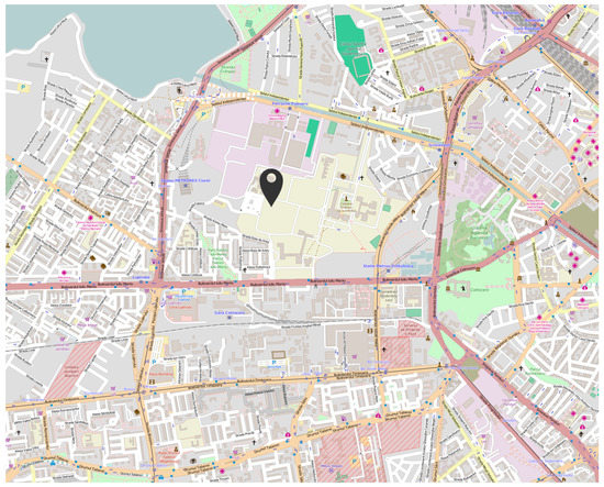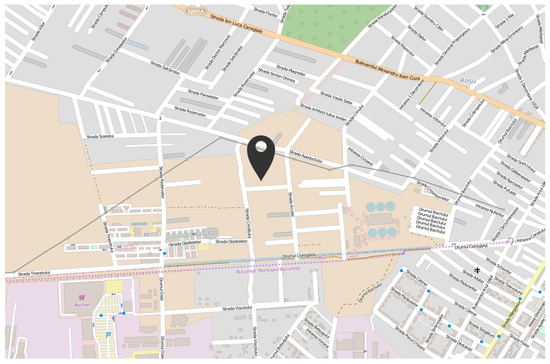 In the second scenario, the measurements were conducted in the suburbs of the city, as pictured in Figure 12, in a residential housing area near the ring road of the city. This road is a high-speed driveway, mostly circulated by heavy vehicles 24 h a day. Another noteworthy observation is that the area is located near one of the main highly circulated motorways, a waste incinerator, and a cesspool, all of which contribute to the air pollution in the area.