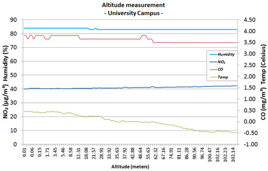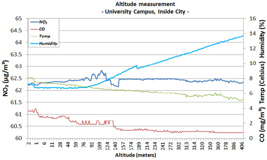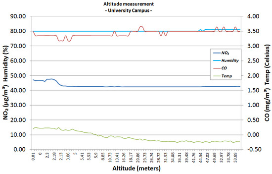 The first urban area sensing mission was performed in the campus of the University Politehnica of Bucharest (Figure 6), both in winter conditions (snowy day) and autumn conditions (sunny day). The following graphics represent the measurements made using the altitude method that has been described in the previous section. Figure 7 and Figure 8 analyse the change in data measured by sensors in respect to altitude during fair winter weather conditions (up to 100 m altitude) while Figure 9 and Figure 10 analyse the data collected during sunny autumn weather conditions (up to 400 m altitude). Both scenarios were recorded during fair wind speeds of 0 to 2 km/h, with the humidity generally stable at a low almost constant value, and the pressure at a normal value of 760 mmHg (1 atm).