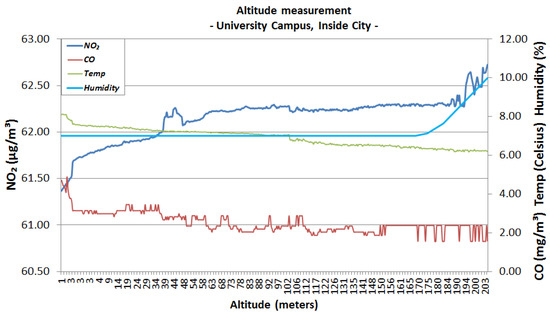 As observed in Figure 7 and Figure 8, the level of NO2 remains stable during the entire ascension of the hexa-copter from ground level to the designated altitude, with a value between 40 and 50 , which is within the Excellent range based on the gradient values presented in Table 2. Analysing the CO levels, the values tend to stabilise between 3.2 and 3.8 , which are classified as Very Good based on Table 1.