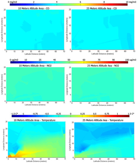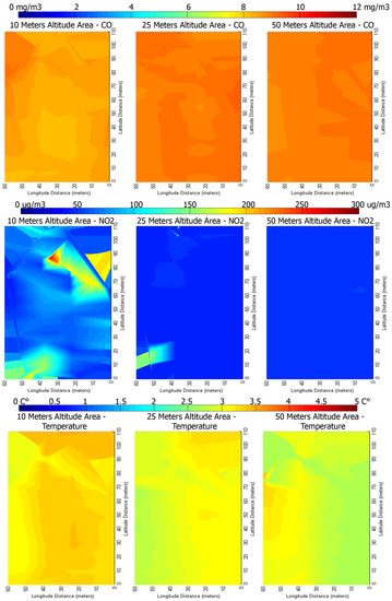 Figure 11 includes heat-maps that represent an illustration of the measurements gathered during the winter snowy day mission, conducted in the university campus. The measurements are taken by using the second type of flying mission (described in Section 3.3), at a constant altitude: One mission to measure at 10 m and another one to measure at 25 m. The 10-m and 25-m CO heat maps show little variation between each other, with values ranging from 3.4 to 4 , which is a Very Good value in the gradient. The NO2 heat maps also show little variation, with levels ranging between 40 to 48 . The temperature variation is just 2 °C.