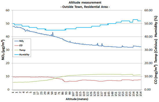 In Figure 13, the sensor readings show that the level of NO2 emissions starts from 49 at ground level and gradually decreases to 32 at 150 m of altitude. Looking at the reference indices for NO2 presented in Table 2, this peripheral side of the city is at the limit of Excellent and Very Good, similar to the previously measured data at the university campus. By analysing the CO emissions, it can be observed that at ground level there is a concentration of 10 and it decreases to 8 at 150 m of altitude, which is at the limit between Medium to Bad, according to the indices in Table 1. The current legislation states that 10 is the limit for protecting human health, so CO should be constantly monitored in this area to detect when it goes beyond the legal limit.