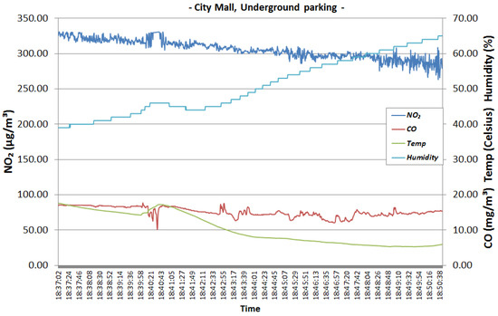 Figure 15 and Figure 16 represent the readings collected in the parking lot. The two graphics show that the levels of NO2 and CO emissions are high. NO2 is somewhere between 250 to 340 which is considered Bad on the gradient scale presented in Table 2, while the CO concentration is between 10 to 20 , which is considered Very Bad. Both NO2 and CO concentrations exceed the legal limit for protecting human health. Most of the gaseous pollutants are emanating from the incomplete combustion of gasoline in car engines. A person cannot spend too much time in an area with so much pollution without health-related implications.