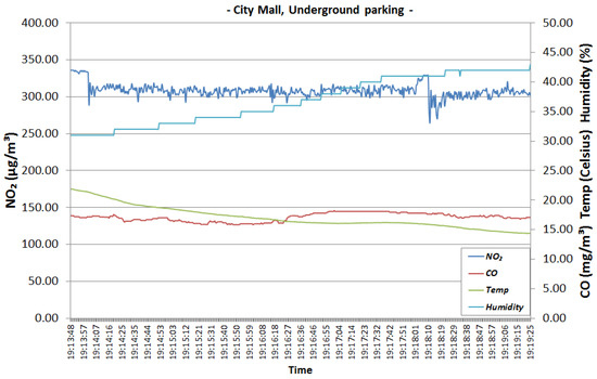 We analyse how sensor data changes throughout time in order to see how gases or air properties can change and affect each other. For example, we can observe that when temperature drops, humidity increases (Figure 15 and Figure 16). Considering the high speed of air currents in the parking lot and the continuous movement of cars and people, we were expecting to see some variation in the NO2 and CO concentrations. However, we can see that they are approximately constant, and there is no relation between each other or between them and the air properties.