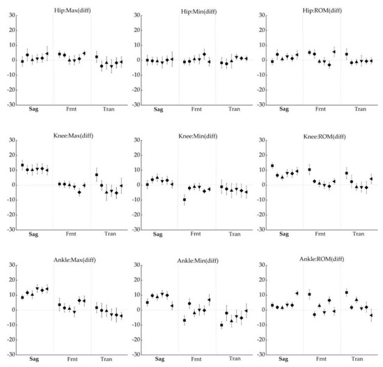 - Fiorentino, N.M.; Atkins, P.R.; Kutschke, M.J.; Goebel, J.M.; Foreman, K.B.; Anderson, A.E. Soft Tissue Artifact Causes Significant Errors in the Calculation of Joint Angles and Range of Motion at the Hip. Gait Posture 2017, 55, 184–190. [Google Scholar] [CrossRef] [PubMed]