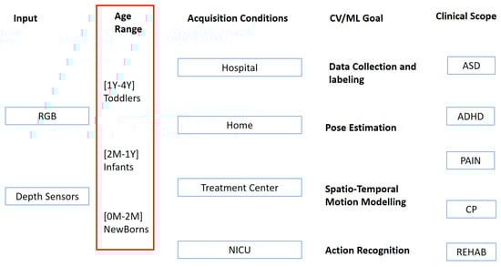 Alternative taxonomies can be pivoted either on the computer-vision/machine learning tasks actually addressed (data collection and labelling, static pose estimation, spatiotemporal modelling of motion, action recognition) or on the high-level clinical tasks pursued (ASD, CP or ADHD detection, pain quantification, monitoring rehabilitation/training sessions, etc.). All the aforementioned categorisations are certainly valid but, since the assessment techniques and criteria have to be adapted to the age-specific properties of the infant’s brain, in this paper, the categorisation will be carried out considering the age of involved children. It is the main element that pilots the architectural and algorithmic choices: acquisition setups depend on the acquired ability to walk; motion patterns are related to the age (according to previously mentioned assessment theories) and as consequence algorithms have to capture age-specific motion features. In the light of the above, in this paper, three different age ranges are considered to categorise related works in the literature: newborns (up to 2 months old), infants (2 months to 1-year-old) and toddlers (from 1 to 4 years old).