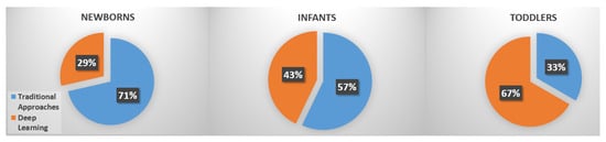 Searching for the considered topic, 20 works were found in the literature, quite equally distributed in the three age ranges (7 for newborns, 7 for infants and 6 for toddlers). It is worth noting that most of the works dealing with newborns leverage traditional computer vision methods (5 of 7). Concerning movements analysis in infants, this trend persists but only 3 of 7 works did not use deep learning-based approaches. Finally, when involving toddlers, the majority of the works made use of deep learning strategies (only 2 of 6 did not). In Figure 2, a pie chart representing the impact of deep learning in each age range is reported. It is possible to observe that when dealing with newborns, most of the solutions made use of ’traditional approaches’, i.e., based on handcrafted features and/or shallow classifiers. The percentage of deep-learning-based solutions increased when infants were involved and became predominant while handling toddlers. This is not surprising since most of the approaches made use of pre-trained models (on adults), and then, it is straightforward to use them on walking children instead of on children in supine pose (in a bed).