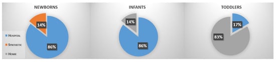 Another preliminary consideration could be made about acquisition settings. In Figure 3, the percentages of published papers with respect to setup taxonomy (home, hospital, etc.) is reported. Methods dealing with newborns were mainly applied in hospital/NICU settings with only one work handling just synthetic data. Home settings were partially used for infants and in most of the experiments on toddlers. Once again, this is not surprising since as children grow, it becomes necessary to assess them in environments where their behaviour is not conditioned by the context.