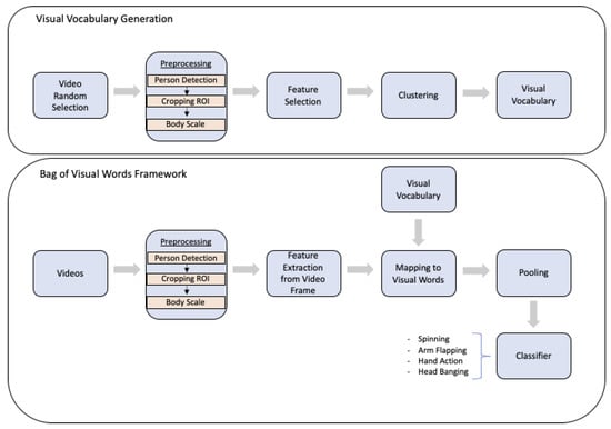 The aforementioned scheme (CNN+LSTM) has been exploited in [] for building a baseline in recognising 4 repetitive actions (spinning, arms flapping, hand action, and head banging actions) that are a potential indication of ASD disorder. Besides, the authors introduced an innovative tool which follows a Bag-of-Visual-Words configuration as reported in Figure 6. It firstly performs a person detection and tracking module by the YOLOv3 detector, feature extraction by Histogram of Optical Flow (HOF), and data clustering by K-means. Then, each video input is coded in visual words that are finally classified by MLP. Inputs are videos of 3-years old children and they are captured by parents in daily living settings. The best algorithmic pipeline (among those tested in the paper) achieved of accuracy. Anyway, the proposed pipeline had several drawbacks and it did not provide satisfying outcomes in natural settings. A reason is that only 2D pose/appearance descriptors and weak models for spatiotemporal information were involved. Besides, the number of videos for tests was limited (i.e., 141) and, in most of them, there was the issue of shaking camera held by the parents during the recordings. Finally, authors in [] applied machine learning methods (Logistic Regression with varying regularization penalties, SVM Classifiers, attempting a wide range of kernels and hyperparameters and decision trees) on ratings of different indicative features of autism from home videos.