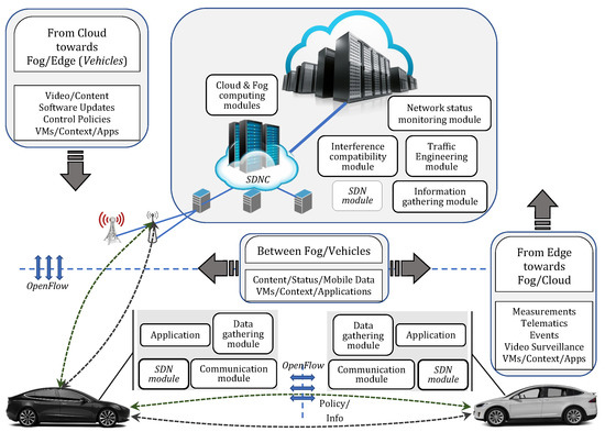 In addition, as the number of smart vehicles and sensors incorporated in vehicles keeps increasing, a huge amount of data will be generated in VANETs. Conventional VANETs, which are based on vehicle-to-vehicle communication and depend only on self-contained resource capabilities, lack the needed resources for dealing with such massive amounts of data. Moreover, the lack of a centralized management entity makes it hard for such dynamic networks to have an equitable share of resources and therefore results in collision of transmitted packets and less efficient use of channel resources [20]. With the integration of cloud-fog-edge computing and the SDN approach within VANETs, prospective solutions in managing the aforementioned problems can be achieved. The main components of this architecture together with the content flow are illustrated in Figure 1.