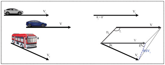 where V is the speed of the vehicle, is the speed of neighbor i, and is the angle between their directions. Then, we use the law of cosines once again to calculate the PCD, as given in Equation (2).