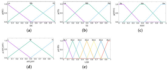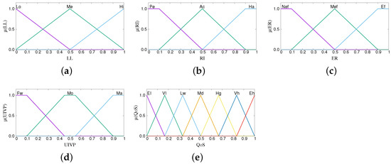 Membership functions of FS-AQoS. (a) Link Latency, (b) Radio Interference, (c) Effective Reliability, (d) Update Info. for Vehicle Position, and (e) Quality of Service.