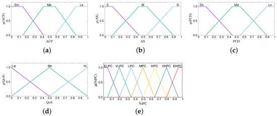 Membership functions of FS-ANVPC. (a) Available Computing Power, (b) Available Storage, (c) Predicted Contact Duration, (d) Quality of Service, and (e) Neighbor i Processing Capability.
