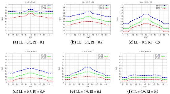 In Figure 8c, we consider the scenarios with LL = 0.5 and RI = 0.5. The results show clearly the importance of UIVP in QoS. A link with effective reliability is no longer enough to have successful communication, as opposed to the scenarios in Figure 8b, where links with high ER are considered for communication regardless of the number of UIVP packets. In these conditions, acceptable QoS values are achieved only for moderate levels of UIVP.