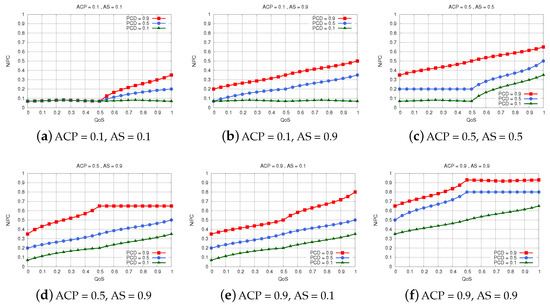 While we have conducted many simulations for FS-ANVPC, the scenarios we present in this paper are the ones shown in Figure 9. The results show the relation between QoS and NiPC for different PCD values. The effect of ACP or AS on NiPC can be seen when a pair of subfigures are selected for comparison, provided that one of the parameters has the same value.