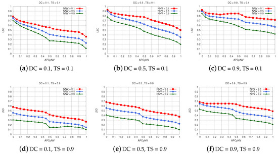 The simulation results of FS-CFELS are given in Figure 10. The parameters considered constant for presenting the results are DC and TS as these parameters represent the application requirements, and as such, they differ only from application to application. Therefore, each subfigure represents practically a different set of applications that have similar requirements. Using this configuration we can see how LSD relates with the changing characteristics of the edge layer, which are represented by NNV and APCpNV.
