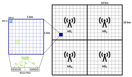 The algorithm’s fundamental idea is to utilize a BF membership test on a mobile node to determine whether or not a new data reading should be reported to the ME host in the period under consideration. As already stated in Section 3.1 in the proposed hierarchical edge-based MCS ecosystem, each ME host is responsible for one square-shaped MGRS area with a side length of 10 km. As this is a pretty large deployment area, it is unlikely that a single user (i.e., worker) can cover it in a short period. Therefore, a worker’s geolocation is mapped to an MGRS area of 1 square kilometer (referred to as a km MGRS area from now on) where a user is currently located, depicted as the dark blue cell in Figure 2. In cases when redundant workers are available in cells of interest, we need only a subset of workers to collect and transmit data, while others may be deactivated to achieve battery savings and reduce unnecessary data reporting. Each worker maintains a BF structure for the km MGRS area where it is currently located, while an ME host takes care of all BFs in its corresponding MGRS area with a side length of 10 km. When a user enters in a new km area and announces his/her capabilities to the corresponding ME host, in the assign message, he/she will receive the active tasks and current state of the BF for this area. Note that each km MGRS area is associated with the one BF structure, which is created and maintained by the ME host and represents the union of BFs of all workers in that km MGRS area. The proposed architecture uses a BF structure both on mobile nodes and edge servers to minimize redundant worker activity while at the same time keeping uniform data density within the area.