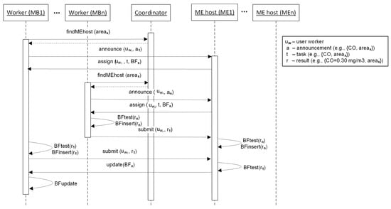 Figure 3 illustrates a scenario in which two workers enter the system and ask the coordinator about the ME host responsible for their geographical location. As they are in the same km MGRS area, the coordinator directs them to the host. After announcing their capabilities to the host, it finds currently available tasks to which they can potentially answer and assigns those tasks to workers, together with the current state of the BF for the area. First, worker produces a result and queries its BF structure to decide whether to transmit this result to the host or not. As this is the first result in the area, the filter membership test reports negative, and inserts in the filter and submits to the host. After receiving the result, the host queries its filter, decides that this result is not redundant, and inserts in the filter. At the same time, worker produces a new result and queries its BF structure to decide whether to transmit this result to the edge server or not. As its filter is not up-to-date, it decides that should be submitted to the host, although it is redundant. Upon receiving , the host realizes that the worker’s filter should be refreshed and sends the current filter state to . Afterwards, worker updates its BF.