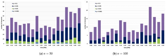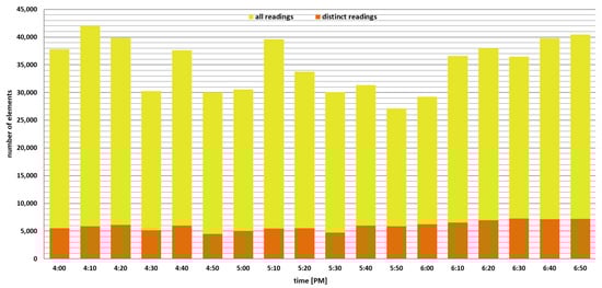 First, we investigate the impact of parameter n on the number of distinct data readings that were lost because the BF membership test failed and concluded that a reading (i.e., the combination of observed parameter and small MGRS area identifier) is already inserted in the structure (although it was not) when a predefined probability of false positives p is in the range from 0.1% to 10%. In the experiment, we use just a subset of data collected in the afternoon during a 3 h period between 4 p.m. and 7 p.m., as shown in Figure 4, and reset each BF structure every 10 min (i.e., a BF validity period is 10 min). Each yellow bar in the graph shows the total number of data readings in the observed time slot (e.g., there are 30,227 readings in the time slot from 4:30 p.m. to 4:40 p.m.), while the orange segment in the bar represents the total number of distinct data readings that must be inserted in BFs during this period. In general, overall users have gathered between 30 and 42 thousand data readings in each time slot, but a relatively small proportion of them are indeed valuable and should not be lost during the BF encoding process (i.e., between 4.4 and 7.2 thousand data readings are unique in each time slot, while other data readings are redundant and can be discarded). Figure 5 demonstrates how the parameter n affects the number of distinct (useful) data readings lost in each observed time slot. In particular, the number of lost elements is represented by blue, green, dark blue, and violet segments in the bar when the probability of false positives p was 0.1%, 1%, 5%, and 10%, respectively. As expected, when we compare the number of lost readings for different values of p, we can see that the lowest error is attained in every observed time slot when the probability of false positives p is 0.001 (i.e., 0.1%). Furthermore, when we compare Figure 5a,b, we can see that a larger value of the expected number of different elements n will considerably minimize data loss, even when p is 0.1, as a Bloom filter will be initialized with a greater number of bits and hash functions. For example, when p is 0.1, and n is raised from 50 to 100, the number of lost data readings drops from 79 (out of 6976) to 22 in a period between 6:20 p.m. and 6:30 a.m., while for it drops from 2 to 0 for the same time slot. In addition, as shown in Figure 5b, there are no lost elements in the entire observed period when and ; however, for , the total number of lost elements is 18, as shown in Figure 5a. In general, we can conclude that if we initialize BFs with a higher n and lower p, we will obtain greater precision (i.e., higher accuracy) because the vector will employ more bits and hash functions for mapping elements (i.e., data readings).