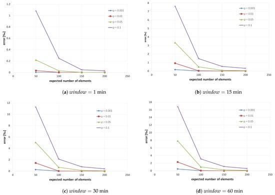 As already stated in this section, referring to [9], we further evaluate a BF structure for the MCS domain with a different input dataset. In contrast to our previous work, where we have used just a tiny dataset containing 200,605 sensor readings (in total), hereafter, we use a dataset that is 23 times larger to thoroughly evaluate the applicability of BF structure in the MCS scenario containing realistic data traces. In Section 3.2, we have already shown that an optimal BF size and the number of hash functions can be calculated from the number of inserted elements n and the probability of false positives p. Therefore, in this part of the evaluation, we observe the behavior of a BF structure when encoding MCS data concerning those two parameters. Our goal is to identify distinct data readings which need to be inserted in a BF during its validity period (i.e., a period prior to filter reset), where a distinct reading is defined as a unique combination of parameter name and a small MGRS area identifier in the observed time slot. In other words, two data readings are redundant if they are collected in the same time slot (e.g., 5 min period), inside the same MGRS area of 100 × 100 m2 (i.e., small MGRS area) and associated with the same parameter (e.g., ), and only one of them should be inserted in a BF structure during that period. A BF is reset upon the end of each time slot (e.g., 5 min period), meaning that a new empty BF structure, which will be used in the next time slot, is initialized. As we can assume the expected number of data readings that need to be inserted in the filter (i.e., n), and we can set the desired probability of false positives p for an MCS service, in all experiments, a filter structure is initialized with an optimal number of bits m and hash functions k calculated from Equations (4) and (5). Note that in our previous work described in [9], we have used just one filter for the evaluation purpose, meaning that all data readings have been inserted in the same BF structure, while in the remainder of this section, we use multiple BFs, one for each active km MGRS area following the proposed algorithm as described in Section 3.3. In addition, to give a reader true insight into the error rate caused by using the BF structure for encoding MCS data, it is not realistic to insert all of the 4.7 million data readings that have been placed in a single day (as previously described) in just one filter structure.