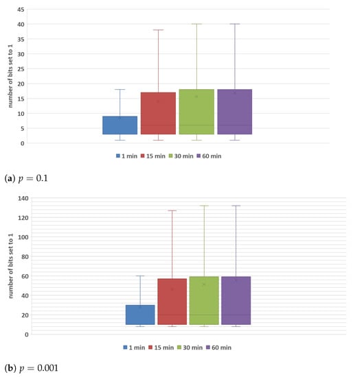 Finally, for each BF associated with an active km MGRS area, we analyze how many bits in the BF structure are set to 1, as setting too many bits to 1 can lead to an increased number of false positives, which can result in the lost data readings in our MCS service, i.e., measurements can be discarded because they were marked as redundant. Figure 7 presents the number of bits that have value of 1 when n equals 50 and parameter (Figure 7a) and (Figure 7b). We measured the BF occupancy (number of bits set to 1) for different time windows during 24 h to obtain the distribution of the number of bits that are set to 1. It is important to note that the total size of BF is 239 bits when the parameter , and m is 718 bits for the scenario when the parameter . We can see that the structure occupancy for each observed BF validity period is not close to the maximal number of bits. As expected, the results show that when the BF validity period is just 1 min, the structure occupancy rate is the lowest compared to longer BF validity periods because the least number of elements is encoded in the filter, and there is no significant difference in the BF structure occupancy for longer BF validity periods. In addition, it is interesting to observe that the cumulative distribution of occupancy per BF validity period is not primarily affected by the probability of false positives p, i.e., Figure 7b does not change its shape significantly compared to Figure 7a. That means that the occupancy ratio remains stable despite the increase in the BF size (only absolute numbers correlated to the number of hash functions are affected). Even though the presented graphs show that the maximal number of bits set to 1 is not going beyond 40 (Figure 7a) and 132 (Figure 7b), one should note that there are some points located outside the whiskers of the box plot (i.e., above the ninth decile which are not depicted on the graph). These points indicate that in some periods during a day, some individual filters have more bits set to 1 due to the increased number of data readings encoded in the BF, causing that actual BF error to be greater than the allowed probability of false positives. For example, when the filter validity period is 15 min, and , there is a km MGRS area with 100 distinct data readings in the observed period of which 85 are successfully encoded in the BF, and the filter has 174 out of 239 bits set to 1 resulting in an error higher than allowed. However, one should also note that in this specific case, 1.7 times more data readings were encoded in the BF than expected (i.e., BF expected to receive maximum elements). We have confirmed our initial findings from [9] that the BF overall size and memory footprint allow it to be employed on tiny devices, indicating that the structure is suitable for mobile devices to determine whether or not reading should be transmitted to an ME host.