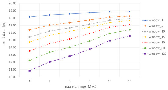 First, we analyze the influence of parameters and on the amount of sent data when the parameter has a fixed value of 1 (i.e., a worker updates its BF structure after submitting the first result in the small MGRS area). In other words, Figure 8 depicts the cumulative number of results that were sent by all workers in our distributed system when an MCS service deployed on the ME host requires up to 15 results per each small MGRS area, and each worker is instructed to submit only one result per small area. As expected, the results show that with a longer duration (i.e., the BF validity period), the number of sent results will be lower because the time between two consecutive filter resets is longer, and workers discard more results. In particular, when the filter reset period is 1 min, the percentage of useful data sent by all workers is between 18% and 19%, while with the reset period of 120 min, this percentage drops to values between 11% and 15.5%, depending on the required number of workers per small MGRS cell. We can see that when has the value of 1 (i.e., ME host requires only one result per every 100 m2), the amount of generated data is the lowest, because hosts update their BF immediately after they receive the first result for the small MGRS area. In contrast, for bigger , hosts expect to receive more results and update their filters less often, which leads to a higher amount of data sent by workers. When the filter validity period is 1 min, the influence of the parameter on the percentage of sent data is not significant because there are not many workers located in the same area in such a short time interval, and the amount of redundant data is similar regardless of the required amount of data per small MGRS area. On the other hand, when filter reset occurs every 120 min, it is very likely to find more workers in the same area who can submit data during the observed period, which results in greater differences in the percentage of sent data for different values of the parameter . For example, when is 1, the required amount of data on the ME host is collected very soon. Suppose other workers come to the same area in the remaining period. In that case, they will be instructed not to produce measurements because they receive an updated version of a BF (i.e., the host has already inserted received results in the filter), while when is 15, more workers who send an announcement later in the time slot will also receive an initial (empty) version of the BF, and the ME host will receive more data readings. Overall, we can conclude that more than 80% of data readings produced by all workers in the system are never sent to edge hosts even in the worst-case scenario when the filter validity period is only 1 min, and MCS service requires up to 15 results per each small MGRS area. That is a significant reduction in the number of transmitted data compared to a baseline approach where all produced data readings are sent to the cloud server.