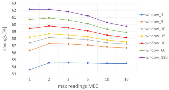 Next, we observe the possible energy savings achievable with our approach compared to the baseline approach when all results produced by workers are transmitted to the ME hosts. Given that the energy consumption is in a linear relationship with the number of generated messages, the savings can be calculated as the percent decrease in the number of transmitted messages generated by our solution as compared to all produced results (see Equation (8)):