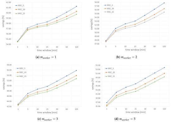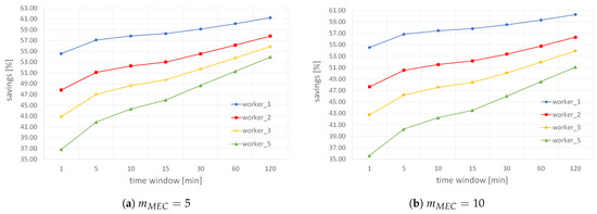 Next, we analyze how the number of results a worker needs to submit per small MGRS area and the length of BF validity period influence the total savings while keeping the fixed value of , as shown in Figure 11. The results indicate that when increasing the time between consecutive filter resets (i.e., ), the influence of the parameter drops. In other words, when the filter validity period is just 1 min, the difference in savings for and is around 18% (i.e., the total savings is 18% lower when workers are instructed to submit five results per small area), while this difference drops to only 7.5% when filter reset is every 120 min when the parameter has a fixed value of 5. Similarly, when is 10, the difference in savings for and is around 18.5% when is 1 min, and drops to 9.3% when filter validity period is 120 min. In addition, we can see that the total savings slowly increases with a decrease in the value of parameter because an MCS application deployed on ME hosts requires fewer results. In particular, when workers submit only one result per small MGRS area and the filter validity period is 120 min, the total savings goes up to 61.2% when is 5 (see Figure 11a), while it is less than 1% lower when ME host needs up to 10 results per small area (see Figure 11b). That is a significant result because savings remain pretty high even for many data readings required by an ME host.