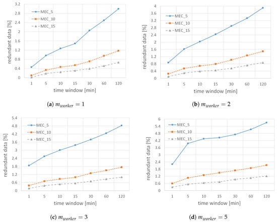 Finally, we analyze the influence of parameter on the cumulative amount of redundant data received by all ME hosts for different filter reset periods and application requirements in Figure 12. As already stated, a data reading is redundant if an ME host already contains the same combination of the observed parameter and small MGRS area identifier in its BF structure. Note that the percentage of redundant results is expressed concerning the total data received by ME hosts. As expected, the highest percentage of redundant data is received when hosts require only five data readings per small cell before updating the global filter for the area. The lowest amount of redundant data is received when hosts require 15 results for all observed scenarios, regardless of the time window in which BF is reset and parameter , because for smaller values of , hosts will update their filters very soon, and subsequently received results will be redundant. When we compare savings for different BF validity periods, we see that the amount of redundant results received by ME hosts grows when the time between BF resets increases. If the filter is valid only for a short period, the probability that more workers will be within the same small MGRS area during the same time slot is low. In other words, likely, hosts will not collect the expected number of results per each small area because the filter will quickly reset. At the same time, it is quite possible that within, for example, 120 min, more workers will pass through the same small area, and because of the relatively high values of the parameter , a filter they receive may still not be updated with recently received results, which may later cause a more significant amount of redundant data in that area.