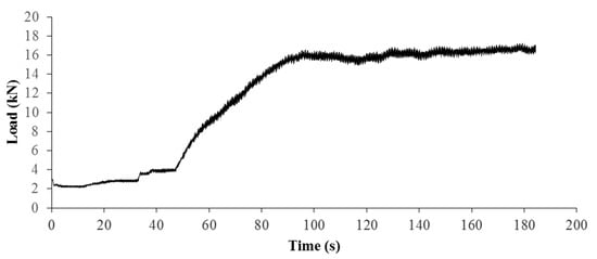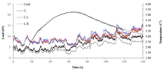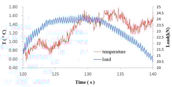 Figure 5, the load peaked at 96.30 s after the test commenced. After 96.30 s, the temperature of certain points on the specimen’s surface appears to increase at a slightly higher rate than the rest. One example is indicated in