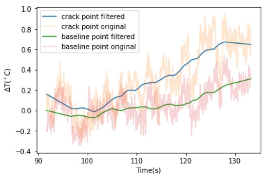 Figure 7. The temperature profile was set relative to temperature changes, with 0 chosen as the initial temperature at the reference point. The temperature changes were filtered by implementation of a Savitzky–Golay filter.
