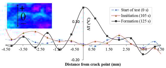 Figure 8. The temperature profile at the start of the test (0 s), immediately before the crack occurs (105 s), and after the crack forms (125 s), are plotted. Before the crack occurs, there is no significant difference in temperature between the potential crack point and the rest. After the crack is formed, the temperature at the crack point is 0.57 °C higher than those at the points not influenced by the crack.