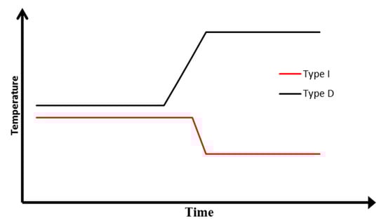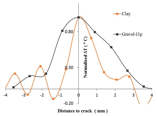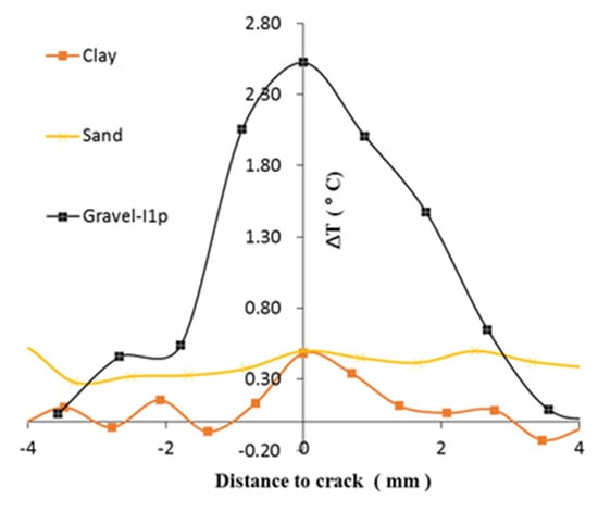 Two types of cracks were observed during the compression test of the gravel specimen. The cracks, which occurred in-between gravel particles, caused increases of temperature at the crack point. Such cracks were denoted as I1, I2 I3, and I4 for ‘increase’. Temperature decreases at the crack point were observed for cracks which occurred within the ice block. Such cracks were denoted as D1, D2, D3, D4, D5, and D6 following the capitalized initial of the word ‘decrease’. The ideal temperature variation for cracks of types I (increase) and D (decrease) are illustrated in
