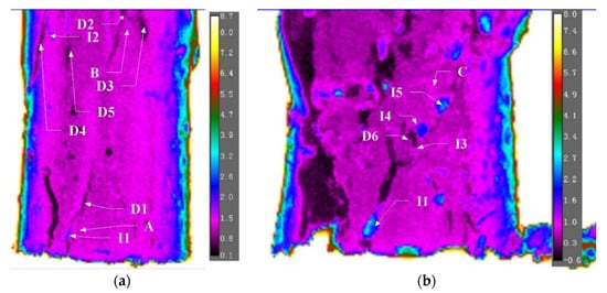 In the same manner, the time, , represents when the crack is fully developed and is recorded for cracks I2, I3, I5, D1, D3, D4, and D6. After a crack has formed, the temperature may still vary, subject to the change in stress-strain conditions. Thus, the for crack I1 at the stress-softening stage (denoted by the initial ‘s’ as subscript in ) and plastic stage (denoted by the initial ‘p’ as subscript in ) and for Crack I2 at the plastic stage were also calculated.
