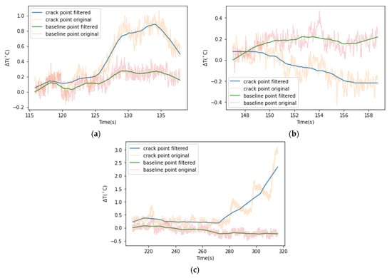 (temperature change)-t (time) curve for the crack point and baseline points are plotted in