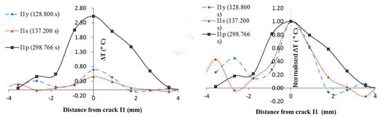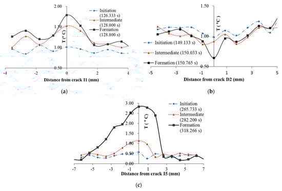 Figure 13c, respectively. Crack I1 occurs at the time of yield. Before the crack initiates, the temperature of the crack point is relatively constant and approximately equal to the baseline temperature. The